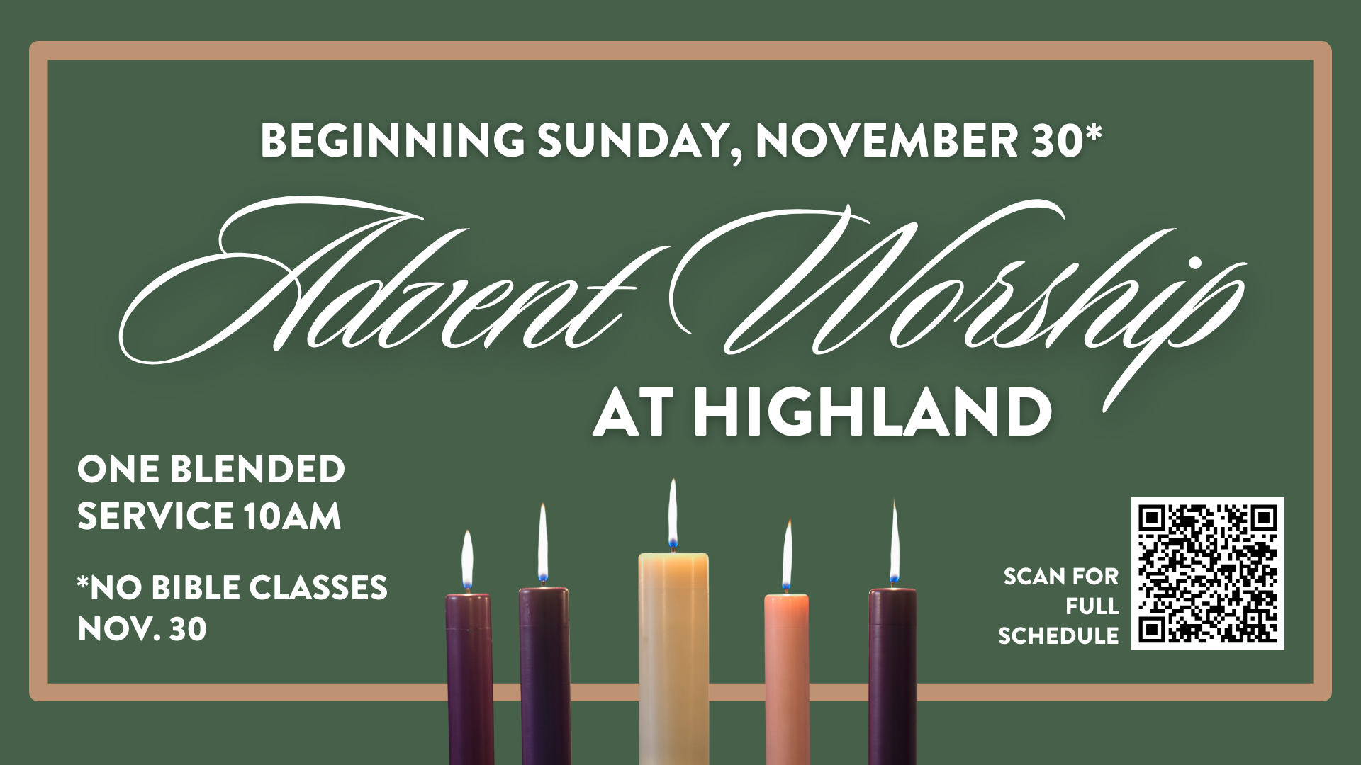 Each year, Highland celebrates Advent and the Christmas season by coming together in one weekly blended worship service. Join us as we return to this Advent rhythm on Sunday, November 30! Blended worship will begin at 10am, but Bible classes will not meet on Nov. 30.