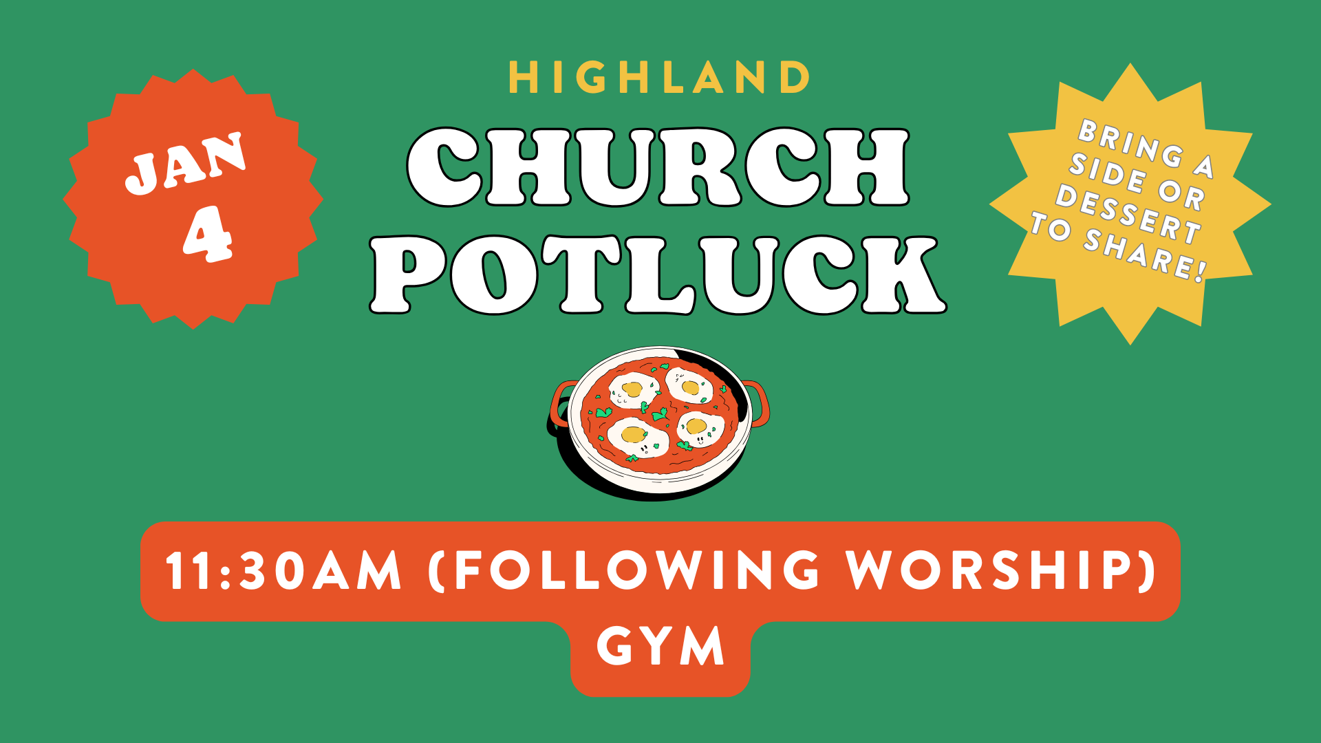 We’re back from the holidays–let’s eat lunch together! Church is providing mains for everyone to enjoy together in the gym at 11:30, right after service Sunday, January 4. Please bring a side or dessert to share!